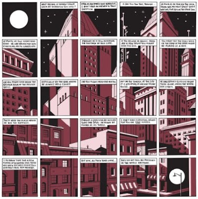 There's never a real sense of mystery to be found in this story, another deliberate move by Seth. We understand early on why Sprott feels regretful and whom he hurt and how. There's something about details being revealed to the reader that concretizes the experience all the more, making us both pity and feel shame for Sprott. In the end, the narrator doesn't pretend to try to wrap things up or make sense of his life. We don't know if George's affection for his niece proved to be some form of redemption, or if that concept has any meaning at all in this context. From a purely materialist standpoint, the strip about a collector TV ephemera proudly showing us his Sprott collection was both touching and pathetic. Touching in that in some small way, Sprott won't be forgotten--but pathetic that he will only be remembered as a sort of trivial fetish. The scattered array of panels toward the end that represent Sprott's last moments recapitulated the way his life was represented in the book: fragmented, episodic and filled with meanings that are not easily teased out.