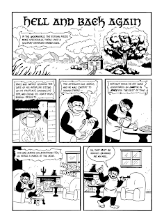 Chimps In Space #1-3, by Donna Almendrala. These three comics are Almendrala's way of exploring genre stories using the titular chimp characters, mixing extreme silliness with a genuine affection for each genre. The first issue is an outer space story where we eventually learn that the captain of the ship (who is narrating the story) is a complete idiot. It actually is less of a space adventure than a locked-door murder mystery whose resolution is also quite silly, especially when the captain tries to tack on a Star Trek-style moralistic message at the end. The second issue follows two of the crewmembers on a planet where they engage in Western-style hijinx; the beginning of the story is taken from an anthology story Almendrala did a while back. This issue was the most forgettable of the three, as it was really all over the place narratively and in terms of tone. I liked the third issue best, which featured the adventures of a dead crewman in the afterlife who is recruited to join Hermes, Ulysses, Hercules and Achilles to go on an adventure. He is reluctant to join this motley crew, which is why generates both narrative friction and humor. Almendrala really seems in her comfort zone with this comic, easily navigating fine details regarding mythology while reworking them for comedic purposes. There's an easily-detected Ernie Bushmiller influence in her figure drawing and use of spotting blacks, making each page a pleasure to read and giving each image a certain comedic charge. Even before she sets up a single gag, I found myself being amused by the figures themselves. I'd love to see her take on more mythological stories in a comedic tone because of the fluidity of that third issue.