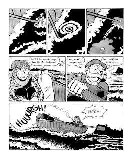 Rockall #1, by Amelia Onorato. This is the first issue of what is shaping up to be a fantasy/romance story set in an island off of Ireland. We meet Tommy Kagan, a young man who has purchased property on the island is rowed out there at the beginning of the story. He quickly discovers two things: like all small communities, the island is a place where your business is everyone's business; and there are two inhabitants in the house he has bought. One is a woman accused of being a "selkie", a seal who takes human form who can be captured by a human who happens to see her dance. She can only be freed if she finds her skin after her human master has stolen it. Onorato wisely plays coy as to whether the woman is actually a selkie, though she is indeed searching for something and is trapped on the island after her husband mysteriously died in a fishing accident. That's an event the islanders blamed on her ("calling up the sea"), sparking mutual distrust and loathing. This is obviously a groundwork-laying issue, but it's one that's well-structured and built in part on a patois that is at once distinctive but not confusing. One gets a real sense of time and place very quickly in this comic. Onorato's line is simple, cartoony and expressive. The comic did cry out for color, however; a light green wash or even some kind of blue-green duotone would have looked much better than the grey wash used on a number of pages. I'm quite curious to see how the story proceeds.