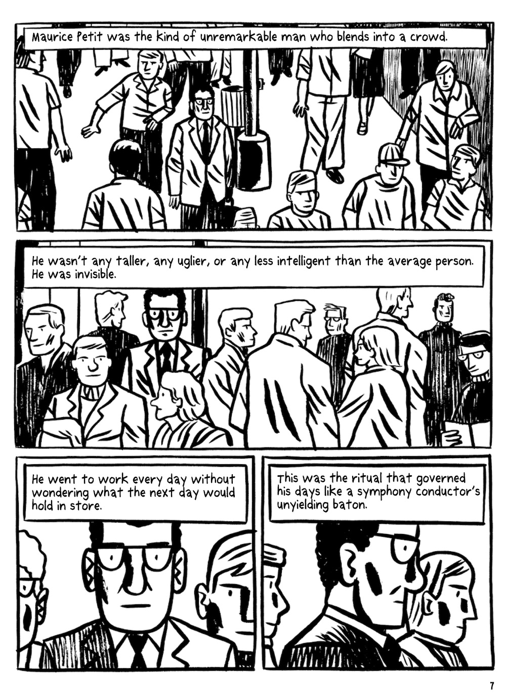 Inevitably, he picks the wrong funeral to attend and opens his mouth when he should have kept it shut. This leads to his inevitable doom, yet his story is a triumphant one in the end because of those he touched -- and one woman in particular, in an amusing twist that calls back to his horoscope. Obituary Man is a marvel of storytelling economy. In four short chapters and 84 pages, Girard establishes the highs that Maurice reaches as a funeral orator, his eventual and tragic downfall and demise, and the upbeat denouement that reveals his impact and what made him happy in the end. Girard's figure work is simple and stark, getting across the broad strokes of emotion with little exaggeration. That brush of his was adept at showing grief, joy, relief and pure menace. Girard made Maurice come alive so effectively because of his understanding of how to incorporate simple but important details into the narrative: precise descriptions of his never-changing desk and coworkers, the stony countenance of the firm's secretary, the emotional stew of a funeral service, the hulking and intimidating presence of dangerous men. Even a slightly hokey plot twist felt like a genuinely tragic series of events. Girard takes a clever idea and turns it into a humane and beautiful message that is entirely earned because of the adeptness of his storytelling.