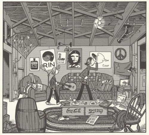 After every subplot and character is swiftly introduced, they get moved to the background so Rabagliati can concentrate on telling Paul's odyssey as a Scout. He delves deep into the stories of each of the three Scoutmasters. One is gay (and has a boyfriend jealous of the time he puts into scouting, which is the one time the matter of pedophilia is raised), another is a working stiff he lives to provide direction for the young, and a junior scoutmaster is a college student interested in radical politics. It's those politics that provide a tenuous link to the FLQ and their increasingly violent methods and give the reader a sense of suspense while reading the story. However, that suspense is less important than the loving detail Rabagliati gives to Paul's first camping trip. Other than the gravity of having to camp outside in the open by himself for one night, there's no dramatic tension in this sequence. It's simply a collection of character sketches and bonding rituals that detail how much being a Scout came to mean to Paul, and by extension how much the members of his troop came to mean to him. Rabagliati depicts the occasional personality clash, but it's nothing on the scale of something like Mike Dawson's Troop 142. There's simply a tremendous amount of warmth in Rabagliati's depiction of Scout life, and he depicts this as an unambiguous positive in Paul's life during the same period where he has his first love and discovers how much he loves to do comics. That he has so much of this yanked from under him at the end leads to a downbeat denouement. The resolution of his mother's feud with his grandmother is equally tragic in its own way; their inability to co-exist robs Paul of that intimate family connection (even if it' with good reason). The final, silent pages of the book are Rabagliati's tribute to his fellow Scouts, each one its own powerful image. Rabagliati has been accused by some of being emotionally manipulative and sentimental. While that can be true at times because of his tight control over the emotional content of his stories, I see him as earning the right to draw out that emotion from readers with carefully-laid details that allow the reader to take each character as they are, both positive and negative, and see them as fully fleshed-out human beings. It's easy to feel moved by the triumphs and tragedies in a Rabagliati book because of his genuine sincerity and his skill at painting complex portraits of each character, not the least of which is his own stand-in.