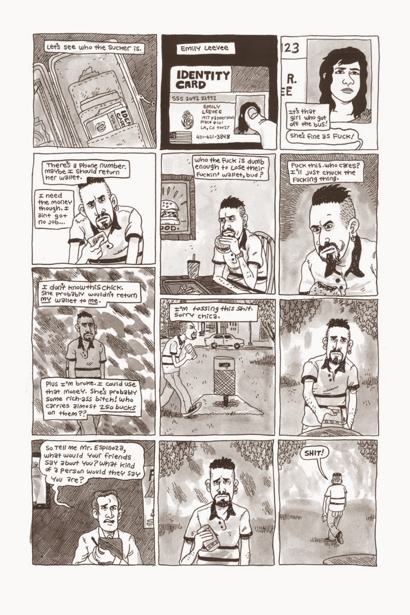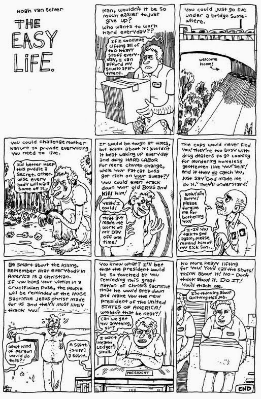 “1999” is my favorite of Van Sciver’s short stories. It’s the most clever and complex of his comics, filled with a grim sense of doom and ambiguity that’s tied to the Y2K panic. His lead character, Mark, is a college dropout who works at a sandwich shop and falls in love with Nora, a fellow shift worker who claims to have an open marriage right before they engage in daily sex on the job. Things naturally go awry. The ending of the comic, beautifully set up with a clever bit of foreshadowing, turns the drama entirely on its head after pulling the reader along through sequences that seem to make no sense, all against the backdrop of a doomsday event that never happened. That Mark will have to keep on living the same miserable life is not explicitly stated, but it seems the obvious outcome. Van Sciver’s line and layout skills have become refined without losing any of the raw, nervous energy that’s always been a key element in his comics. He varies his layouts from page to page, slowly adding more panels per page as the comic proceeds and things get more suffocating for Mark. Zip-a-tone style effects are added during both sex scenes and larger images of emotional turmoil, equating the two as a kind of vertigo. He’s great at drawing plain-to-ugly characters wearing drab clothing who slouch a lot. This is a funny comic about sad people, which is starting to become a specialty of Van Sciver’s.