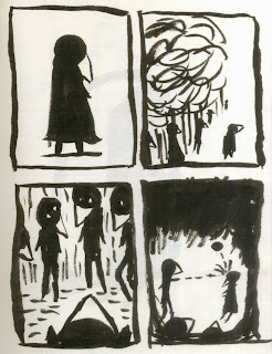 Bird Girl, A Mass Of Shapes and Scratches and Astral Birth Canal 0, by Reilly Hadden. Hadden is a talented second year CCS student, and these three comics show three radically different styles and approaches. Bird Girl, a tiny mini with a dashed-off and scribbly approach, represents Hadden at his most spontaneous. It follows around the titular character and her abuse at the hands of her fellow birds, and then takes a hard left turn when she's abducted by aliens and pecks the eye out of a carrot-like creature. The entire thing feels spontaneous and free, as though Hadden wasn't sure how he was going to solve a storytelling problem until he got there. The heavy use of blacks, the sullen but expressive bird characters and the freewheeling scribbles on each page represent a cartoonist who's in his own private comfort zone, simply making up silent stories as they come to him.