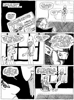A Mass Of Shapes And Scratches, on the other hand, is a little more labored. It's essentially an argument between two friends about finding meaning and the essential fruitless meaninglessness of life. That argument is given a kick in the pants by the end of the story, as they work through the one man's nihilism, only to see him trip and hit his head hard on a table, leading to his demise. It's kind of an obvious gag, and the neurotic energy Hadden brings to the page with extensive use of hatching, cross-hatching and spotting blacks is undermined by the stiffness of his character design--especially in how characters relate to each other in space. While there are interesting ideas here, this is a comic that feels underbaked on the whole, though it clearly represents the artist trying to break out of his comfort zone.