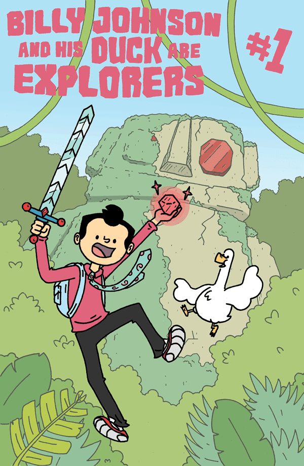 Billy Johnson and His Duck Are Explorers, by Mathew New. Mixing in equal parts Herge', explorer story tropes and absurdist humor, New's comic is both an affectionate send-up of and tribute to the intrepid explorer story genre. Starting the story in the middle of a chase with an irate gorilla, the titular hero and his talking duck friend, New immediately plunges the reader into the adventure and rightly concerns himself only with the facts at hand: there's a young adventurer with a sword (its name, "Mr Jabbers", immediately reflects how silly all of this is), a duck that talks and a gem-encrusted idol that the monkey wants back. It's deft, exciting and funny storytelling, given some weight by his bright but not garish use of colors. As the adventure proceeds, New slowly provides backstory as to why Billy does what he does: he's trying to impress an explorer's society, he's trying to live up to the example of his dead parents, etc. (We never do find out why the duck is a professor or why he can talk, but that's neither here nor there as it relates to the protagonist's primary narrative.) After a crazy adventure involving secret maps, a lost monkey city, treasure and aliens, Billy winds up with no proof of what he just did. The reveal on the final page as to what Billy really does for a living is surprisingly touching and sad without being maudlin. This comic is well-crafted, breezy and adds some surprising depth; it's a comic that I can now easily being transformed into a young adult comics series.