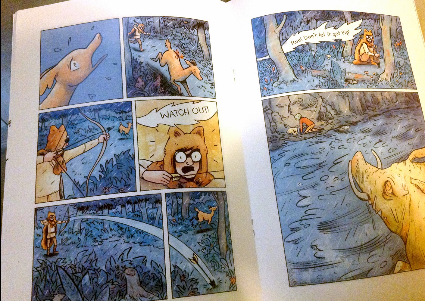 The first chapter gives the reader a lot of backstory without actually dumping much text on them. We know the hunter with the bow is August, we learn that he's a renegade and hunted by his cruel father, and we know he's not much of a joiner. By the end of the first issue, his fate gets tied to that of a group of forest adventurers, entirely against his will. There are beautifully staged chase and action sequences, moments of humor, and instances of deep emotion. What I admire most about the comic is that despite its obvious young adult target range, it's a comic that doesn't talk down to readers, nor does it telegraph its immediate themes. Starting the book in the middle of a hunt gives the reader a great hook, rather than saddling a reader with a lot of backstory. It works because the reader is meant to feel and empathize with all of the relationships in the book: betrayed son, vindictive father, tight-knit group of friends and a general fear of the unknown.