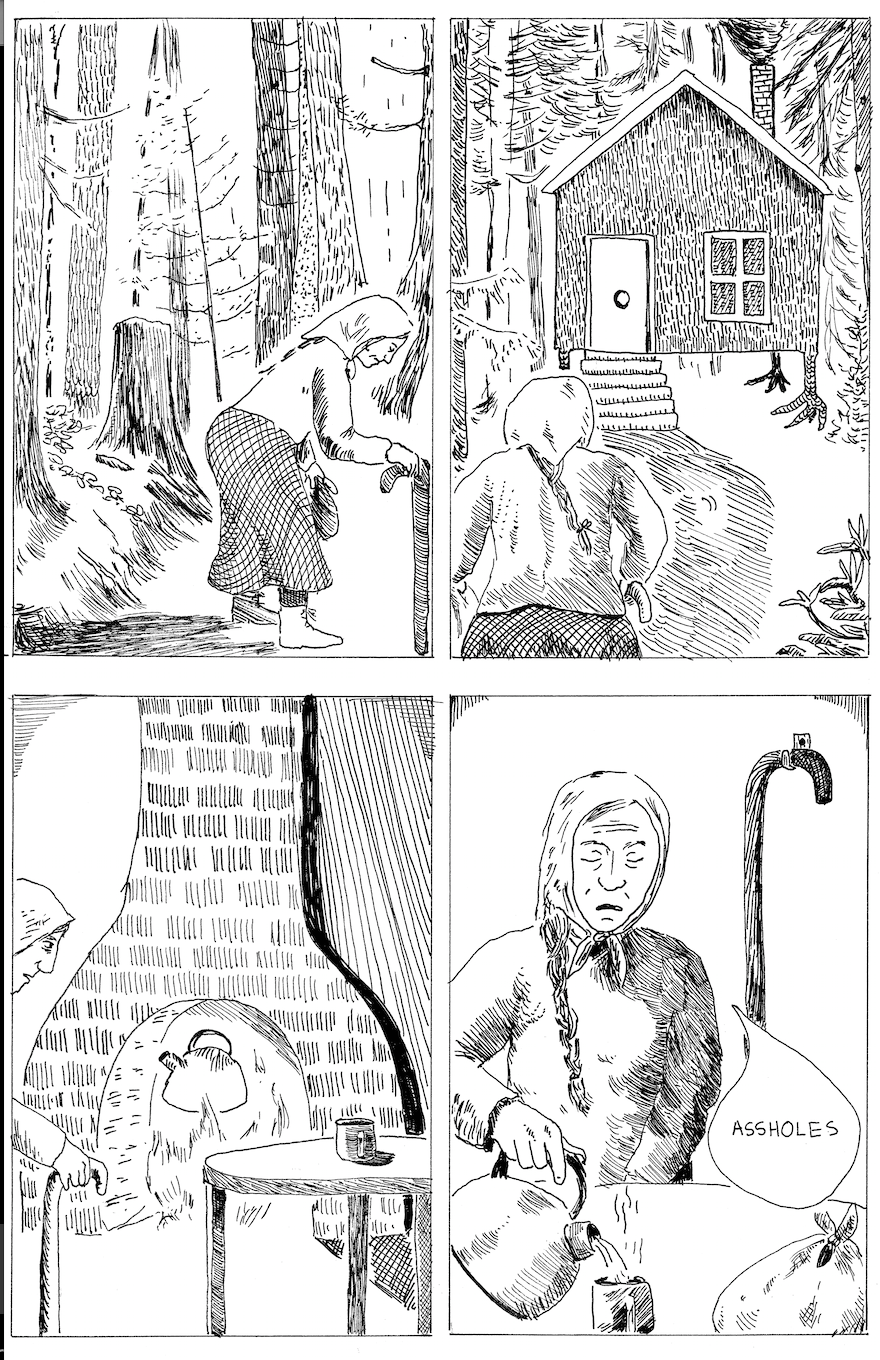 The rude guy winds up in a boarding house for ghosts, led there by a man who turns into a woman when he walks into the house. Yolanda winds up back at Baba Yaga's house yet again, and this time the house (always on chicken legs) picks up and leaves with both of them in it. Meanwhile, the ghost, in search of Baba Yaga (ironically so that she could remove the very curse she laid on him, unbeknownst to him) is left behind. With a slightly ratty line that adds additional ambiguity to every panel, this is a story about visibility, agency and transformation. Here, the visibility and agency of the unnamed ghost are abruptly taken away from him after a lifetime of presumed privilege. Even as he's invited into a ghost house (in part to relieve him of his money), he is uninterested in actually reflecting on his own life or considering any kind of atonement; instead, he takes what he thinks is the easy way out at first opportunity.