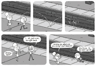 The genius of the comic is that the grossly visceral details are always less uncomfortable to the reader than the increasingly-cringeworthy actions of all three characters in the love triangle. even though the character work is simple, Steshkenko makes extensive use of background characters to provide both verisimilitude and then a kind of Greek chorus to react to the ensuing mayhem. There is a final, hilarious gag that is both over the top and entirely in keeping with the rest of the story. It's the sort of joke that would be a keeper in a rom-com in terms of establishing a relationship. Here, the joke simply elicits horrified laughs. At a deeper level, the character of Jimmy represents the earnest but clueless guy who is completely uninterested in the fact that this woman that he's declared his love to does not want him in any way, shape or form. The horrible fate he suffers is not so much justice as it is a heightening of his totally undeserved confidence and entitlement at a time when he should simply be screaming in pain. This is a sharply observed and smartly designed comic.