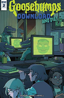 There are evil puppets, menacing skeletons, lizard people trying to infiltrate humanity in order to create more lizard people, and a weird melting kid. The phone makes people sick, allows Mitra to hear the thoughts of others and it makes her paranoid by talking to her. The pacing of the story is a bit wobbly at times, especially with regard to action scenes and the story's climax. While the Goosebumps series is aimed at kids and thus rarely doubles down on its horror elements in a graphic manner, the climax lacks tension amidst its goofiness. The tension that Vaughn builds doesn't quite pay off, and some of that is on Wong. She's great at character interaction, but her panel-to-panel transitions during action scenes aren't especially smooth. That said, Vaughn and Wong stick the landing with the end, which picks up a particular loose end and takes it in a disturbing direction. All told, Vaughn spins a tale that mostly works because of the believability of its cast as well as the existential threat of an all-seeing cell phone.