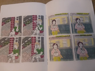 Moments is a profound departure for Sellheim. This mini features her working in color, using a four-color grid to not just depict quiet, quotidian moments in the lives of ordinary people, but to show small but profound changes in expression. In the examples above, we see a person end a phone call, pause and put their head up to their temple. Sellheim here goes after the small moments and the beats between moments, as the pose here went from contemplative to despondent. The scene with the woman on the subway is even subtler, as she's so absorbed in her book that she barely notices the world going by around her. Sellheim here uses color to reinforce line and push the reader's attention to the figure. Color framed that, considering that most of her figures themselves are not colored, drawing the reader to the line art. For an artist who usually depends so heavily on dialogue, it was an interesting and useful exercise.