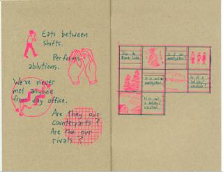 Aaron Cockle's meditation on work, capitalism and the merging of personal and work spaces is a comic called Over Time, Every Section Had Been Allowed To Grow Accordingly. The second issue collects four more stories in this quiet but nightmarish scenario. "Walks Through Untended Orchard" is unusual because it's all figure and illustration work by Cockle (albeit with day-glo colors provided by a Risograph). Most of his strips tend to be collages of a sort or at the very least filled with text. Instead, this is a quiet moment away from everything. There's no work, no information other than the apple tree and the apple. The onomatopoeia of the "crunch" filling up an entire page is crucial, because the whole trip is an appeal to the sense unhindered by technology or the structure of work.