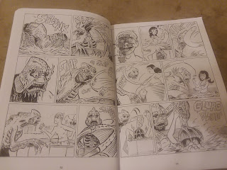 "Dance Of The She Beast/Redneck And The Wolves" speaks to a different kind of femme fatale and a far less discerning audience. It takes the trope of the woman/witch turning into a wolf in the woods and subverts the hunter as Good Guy in this role, with a shockingly visceral death scene that ironically underscores his claims of being a hero. The subsequent story continues his shaky narrative, but there are dire consequences for him as a result. His story starring "Furiosa Frankenstein" combines the Bride of that particular monster with the ass-kicking heroine of the recent Mad Max update. This story mixes horror with action, as she has to fight the creatures in front of her as well as an imagined, twisted version of herself back at the lab where she was born. The visceral quality of his drawings is at his most detailed here, as the monsters drip with menace and gore.