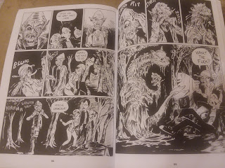 Finally, "Whispers In The Woods" and "The Devil's Magic" reflect St. John's interest in having the mundane confront the extraordinary. The former story is about a couple of friends who go back and forth between thinking they're in horrible danger and trying to disbelieve in it, with increasingly rising stakes. Their reactions to what they see are hilarious, especially as the images become more and more bizarre, disturbing and monstrous--but not all is as it seems. The latter story is a funny, silent story, as a demonic figure shows up at a little creature's birthday party to perform the most mundane of tricks, yet those tricks are more impressive than him appearing and disappearing in puffs of smoke. St. John's line here is thin and expressive, emphasizing the almost dainty quality of the goat-creature magician's hands. This is a strong collection that fans of classic horror and more recent comedy-horror will appreciate.