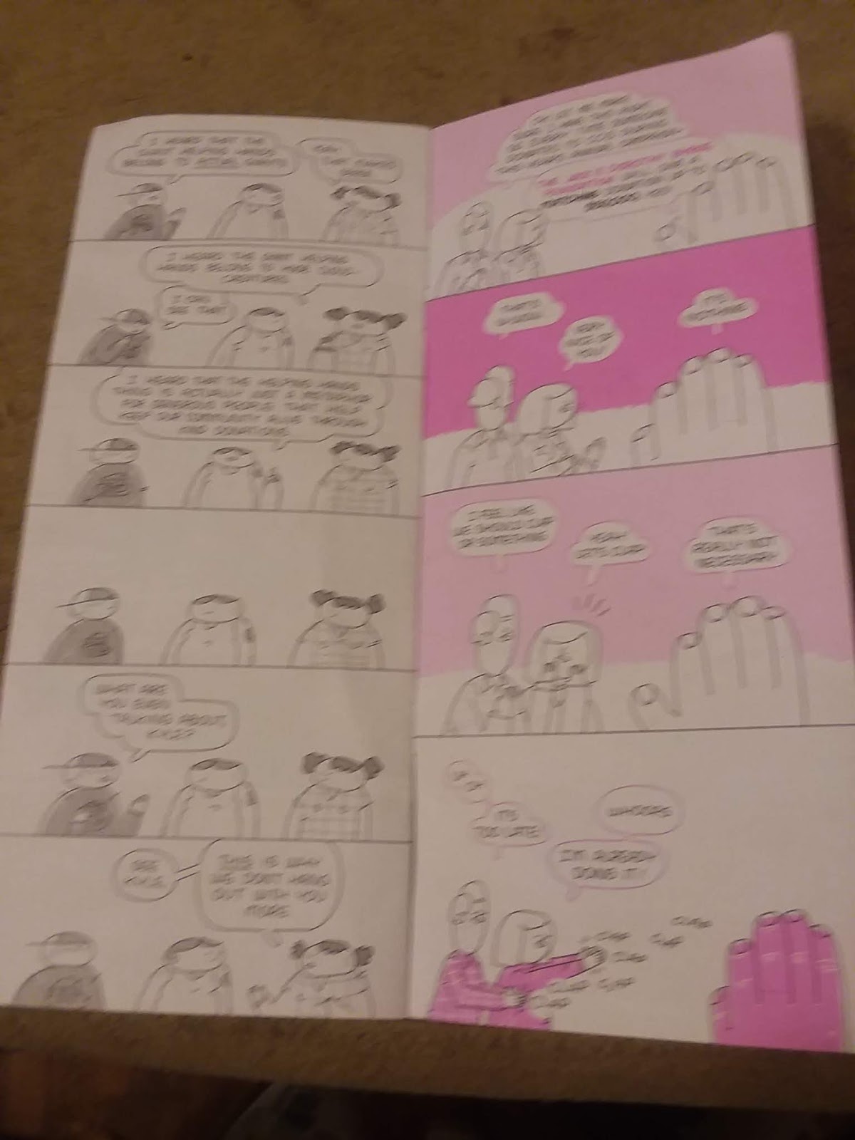 Match, by Luke Howard. Every year, CCS sends out a comics pamphlet detailing the benefits of the school in a general way and specifically asking for donations. Howard, an administrator at the school and also a graduate, wrote this year's pamphlet for 2018. Unsurprisingly, it's funny and quirky, with its main concept being that giant hands from the sky often come to help us when needed. These "helping hands" later help cartoonists match up with "top-notch teachers" at CCS in addition to helping humanity at larger, spurring any number of theories as to what they actually are. Howard, never afraid to go meta, actually has a character posit the idea that the giant hands are a metaphor, which gets the character roundly ridiculed by his friends. At the very end, there's a pull-back that reveals that a grandpa was reading the story to his grandkids, who found it a "little...one-note". At the same time, Howard stays on mission as the kids ask "why didn't the cartoon school just come out and ask for donations directly?"--and then turn and look at the reader.