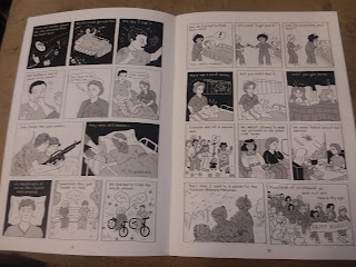 Looking at the supplementary material, it all ties into the main work in some ways because the autobio comics are about him thinking about the issues raised by his book. Basement is a dream comic about looking for the roots of the internet and finding rare, toxic materials that tie into war and then a video game. It's a mishmash that makes sense, and Nott's visual approach (lightly sketchy, with the occasional effect like zip-a-tone to add some weight to the page) has a lightness to it that makes it effective. Internet Search is a funny comic done in landscape form, wherein Nott does a search on the internet and follows every cable until he gets to an exchange point. It's a clever visual representation of the way that the internet actually works. Nothing Works is another landscape comic about infrastructure; it depicts a world where there's no working electricity, water, internet or anything else that requires a massive, mostly hidden support structure in order to keep it functioning.