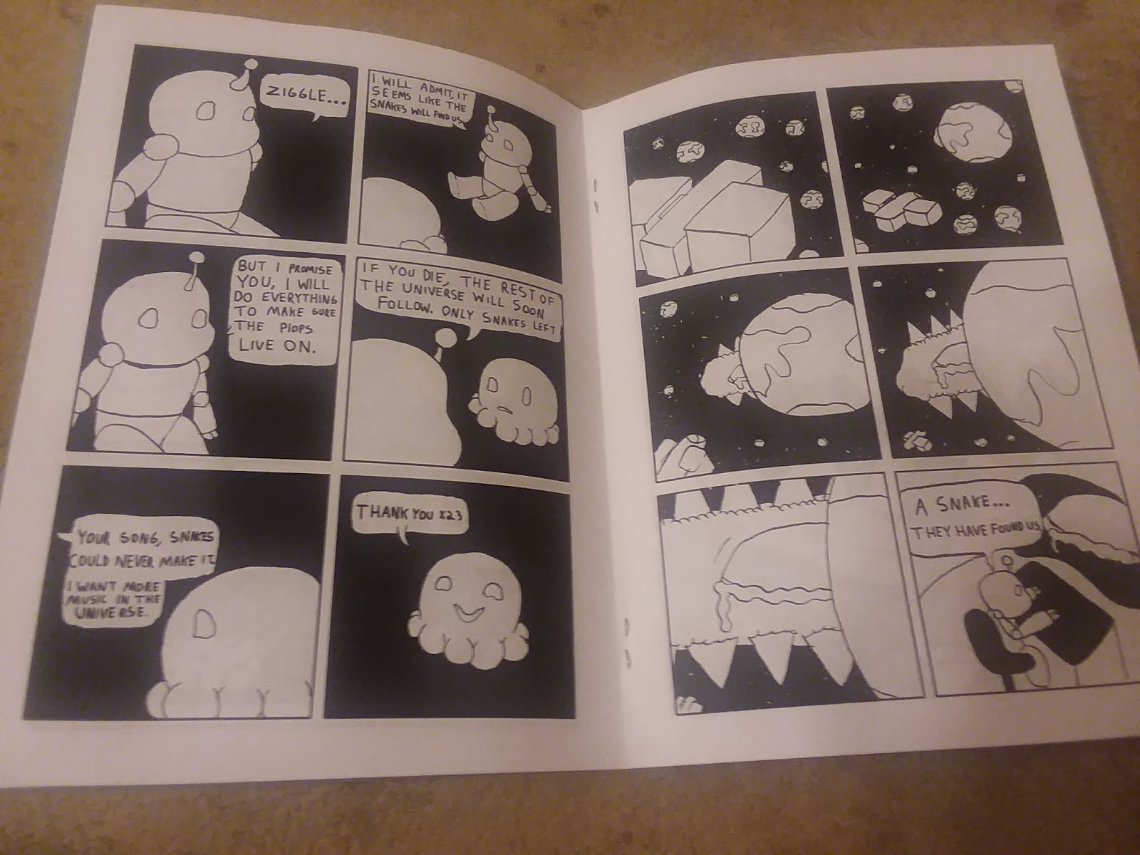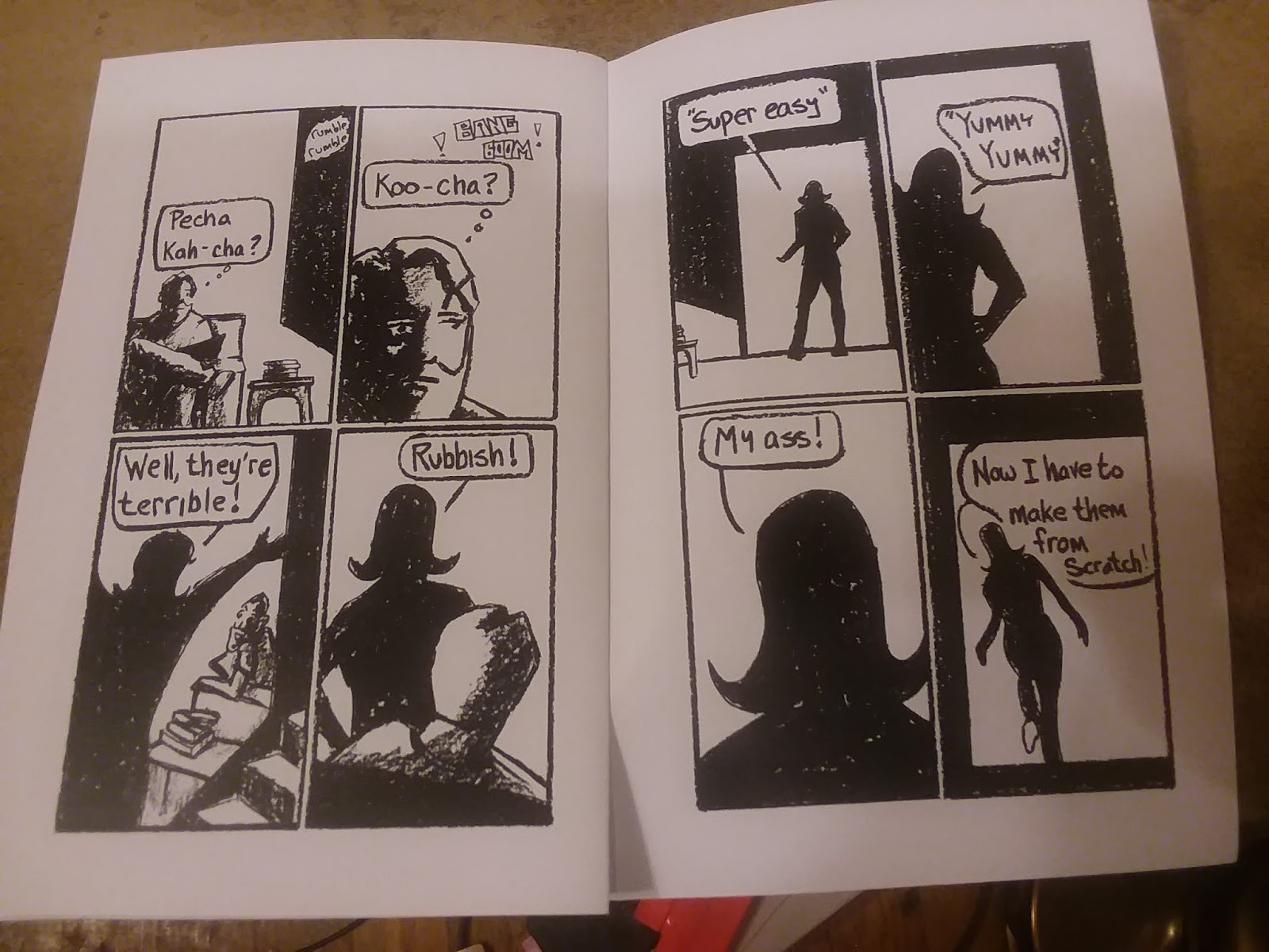 The theme of the first issue is Endings. Tim Patton's stylish strip is about a couple of friends who visit an out-of-the-way coffee shop on its last day, and it's all about that sense of wistfulness that one feels in moments like that. The use of steam lines speaks to the ephemeral nature of the moment and then the memory. Hachem Reslan's silent strip is clever; it starts from heavily rendered as we see two hands: one holding a knife and other other an orange. As there is a surprise thing that is cut, the rendering and lighting gets lighter and less distinct, as though the cut hand is the one that's drawing the strip. Kristen Shull's cartoonish line is a delight in her story about songs that she can't get out of her head; it's a bit of fun that she braces with the final observation that banishing lingering thoughts is much more difficult. Sage Persing makes use of the dark in talking about their childhood OCD thoughts. Leise Hook's obsession with knowing how stories end was also cleverly drawn, with literalizations of the metaphors she was using. Bailey Johnson's drawing of a camera they took apart spoke to the way that working with its parts was soothing.