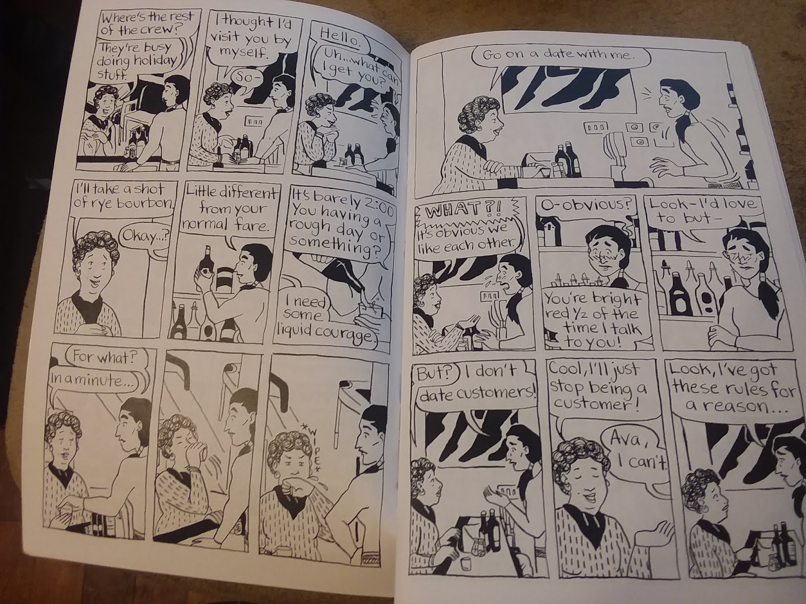 Moments and various short stories by Anna Sellheim. Sellheim quickly became one of my favorite CCS cartoonists on the strength of the rawness of her work. Her autobio material in particular is no-holds-barred with regard to her own feelings and experiences, and I love the jagged, jarring quality of her line and her self-caricature. Sellheim shared a number of her stories from anthologies. First off are stories from a few volumes of the Square City Comics anthology, which she helped start. "The Best Laid Plans", in volume 1, is a work of slice-of-life fiction. It's a romance story, about a bartender who refuses to date her customers falling for a woman who's part of a group of friends who are regulars at the bar. What makes the story work so well is the way Sellheim makes the reader feel the desperation of Ivy the bartender in keeping her life on track as a recovering addict and how hard she clings to this rigidity. In the end, when her life plan goes off track, she realizes that losing control of this rigidity can be a good thing. Sellheim keeps the grid and the art simple, playing up her use of gesture and characters relating in space. This does everything to sell the emotion on the page.