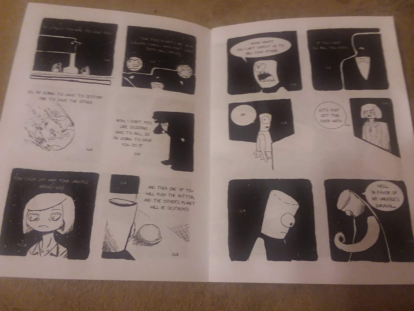 His version of the Aesop's Fables project centered around "The Birds, The Beasts and the Bat", drawn in an ink-stained, Steve Bissette style of art suitable for horror. Everything from his lettering to his scratchy and often spare line was used effectively to create a dark atmosphere. "Metamorsel" appears to be a comic based on Wally Wood's classic "22 Panels That Always Work". There are multiple instances of a variety of different shots, including silhouette, foreground-background switches, light and dark contrast and more. The story is about a father misplacing a cookbook that he thought his wife no longer wanted, and the trouble that causes. "Meditation Comic" uses three different visual approaches, stacked in 2 vertical panels apiece: a sketchy style that utilizes white space, a more labored style that emphasizes light/dark contrasts; and two panels that heavily rely on spotting blacks. The result is something along the lines of a poetry comic, though a bit more scattered because it's clearly stream-of-consciousness. That said, Thomson was able to pull the strip together thanks to its visual elements. Thomson may well be better suited to draw other people's stories, but I'm curious to see what he comes up with in his second year.
