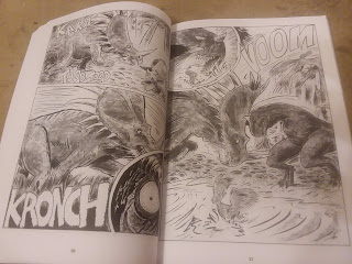Pigeon Man #2 and #4, by Pat O'Brien, Zack Poitras (writers) and Pat Barrett. Barrett drew this visceral, disgusting and over-the-top satire of politics, capitalism and the culture that surrounds them. If anyone was up to the job of drawing the adventures of a superhero who combined the aspects of pigeon and man in the most revolting ways possible, it's Barrett. His humor comics have always had that quality of being game for anything, and that's certainly true here. I unfortunately was only able to read the 2nd and 4th issues of the comic, so I can't comment too much on the story. The basics are that the mayor of New York City is kidnapping orphans and grinding them into sausage, and only Pigeon Man and his friend the Commissioner of the police can stop him. Hilariously, the mayor uses the New York Rangers hockey team as his stooges. Pigeon Man himself is a disgusting character, frequently lapsing into heavy drug and alcohol-fueled binges as he does things like go down on a bat. Tucker Carlson gets seduced, various rescue missions are attempted, horrific sausage is consumed, and Pigeon Man's prison-bound daughter wreaks havoc. The comic is a bit of a grind sometimes because it never lets up, making it something of a breathless experience. Still, Barrett's saturated use of color and ability to mix a cartoonish style with realism make the gags work.
