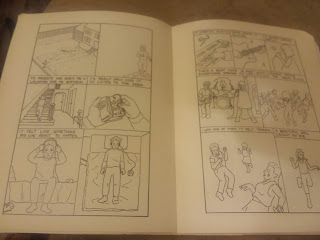 Unsurprisingly, CCS fellow Keren Katz's contribution was hilarious, odd and unsettling. It mixes drawings and photos (with a curly mustache drawn on Katz's face!) as the story follows a curator trying to figure out how to display the new heads. Each image is very typical of Katz, in that she's interested in exploring the way images in motion flatten themselves vs the ways in which still images can be arranged so as to create a strange synthesis. Ghastly's own strip is an amusingly cathartic story where she imagines people she hates falling into an open sewer grate, and then she thinks about what that fate may be. Her use of blobby figures reminiscent of Keith Haring drawings gives her story a strong visual charge.
