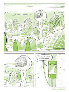 The meat of the comic comes when one worker makes fun of another for eating hearty lunches. As it turns out, the company provides the gear for free but doesn't pay for "wear and tear"...which includes staying within whatever weight class you entered into the job with. It's a staggering revelation that truly reduces each employee to their weight and little else. Leake lets that incident speak for itself without elaborating too much on it, other than a lingering close-up on one employees's wrist counter. It reveals how many hours they've worked and how much they've earned. It's a brutal calculus that reveals the workers as nothing more than a means to an end--especially since the penalties for "wear and tear" are not immediately evident. As always, Leake is an excellent character designer whose expressive figures are the key in restoring humanity to this problem.