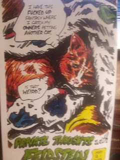 Issue #9 is in his wheelhouse, as it's most gags and stories about the world of porn. Instead of simply doing porno gags, Lange does a series called "Porn Stars I Like." He provides biographical data, quotes, and reasons why he likes them in descriptive and almost poetic terms. Those pages are interspersed with drawings of cats "speaking out" about various topics, as well as collages of porn images with jarring effects. It's a voyage through Lange's id, to be sure, but it feels honest instead of glib. Some of the images (like of a random asshole) are odd, to be sure, but fit into what he's doing in this comic. It's less titillating than it is raw and honest, and he counterbalances exploitation with exploration and humanization of his subjects. To be sure, Lange still attempts to be transgressive at times, with mixed results, but his increasing level of craft as a writer is what's taking him to the next level as a cartoonist.