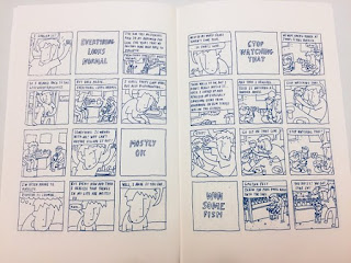 Forever and Everything #3, by Kyle Bravo. This is more autobio work from an artist who previously just went by "Kyle." Bravo uses a simple, stripped-down line not unlike Kevin Budnik, emphasizing character expressiveness above all else. Bravo's line weights don't vary much, nor does he add much in the way of effects like spotting blacks, hatching or shading of any kind. He's fully committed to a 12-panel grid and keeps it simple as a way to keep his vignettes briskly moving. The captioned titles for his vignettes are very much in the style of a Jeffrey Brown, who is another clear influence.