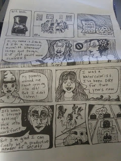 Elise Dietrich and Bridget Comeau both contributed recipes/crafts. For Dietrich, her chicken lentil soup reminded her of a visit to Morocco. For Comeau, it's a way of reducing plastic use by making reusable food wraps. Susan Norton and Kara Torres both use thick lines and dense panel design for different purposes. For Norton, it's a story about feeling constantly uprooted, as defined by having to constantly pack and unpack her record collection. For Torres, it's for a humor strip about "art. anon.", a twelve-step support group of people addicted to the artist lifestyle. Torres nails the language of recovery and addiction for humorous effect.