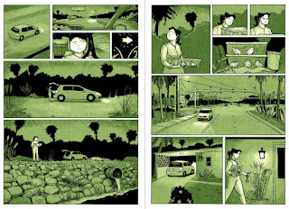 "I Made A Friend," with pink as its spot color, is a horribly tragic and tender account of the magic spark of creativity and how cruelly and quickly it can be snuffed out. "The Situation" is about a woman whose job it is to remove poisonous toads, but who didn't want to kill them. The decisions she's forced to make are heartbreaking, but it's even more heartbreaking when it's clear this experience hardened her emotionally. The pea soup-green in this comic is crucial in establishing its atmosphere. Allie's restraint as a storyteller and willingness to explore emotionally complex characters and situations signals that she's ready to sink her teeth into a longform comic or continue to build this body of short story work.
