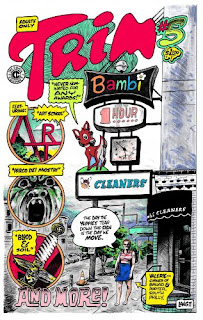 Trim #1, by Aaron Lange. Speaking of Clowes, Lange draws his visual inspiration not so much directly from Clowes but from the sort of art that inspired him: advertising art, romance comics, and junk culture. Lange is a smart storyteller and observer whose work is a sort of second cousin to that of Tim Lane's, as he documents and interacts with people who are outsiders, cast out of and away from society. Take "Vietnam Tom", a story wherein Lange listens to the rantings of a Viet Nam veteran that show moments of clarity and sensitivity in-between moments of sheer, ridiculous madness. Lange keeps it light in this story, setting up the anecdotes as a series of gags.What I like best about Lange's comics is that he has an interest in underground culture without necessarily revering it. For example, "When I Grow Up I Wanna Be Like...William S. Burroughs" takes a wrecking ball to the legendary writer's mystique and hilariously catalogs all of the awful things the writer did and had happen to him. Worst of all: "be read by idiots".