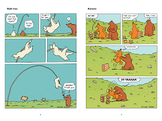 First, the books (co-designed by Mome cartoonist Jonathan Bennett) have the look, feel and shape of classic children's books. They are slim, small hardcovers that any child could pick up and hold. Picking them up reminded me of the first time I read a Dr Seuss book when I was a child. However, there is no mistaking these for illustrated novels--they are comics, told in the language of comics, through and through. We get tipped off to that right away on the cover of each book, because they both depict action and have word balloons. In the most RC Harvey sense of the definition of comics, each of these books carefully combines word and image on every page and requires a reader to understand how they combine to form an experience that is very different from looking at words or pictures alone. They're also very deliberately propulsive in terms of the action on the page, emphasizing panel-to-panel transition and the way that motion can be depicted on the page.