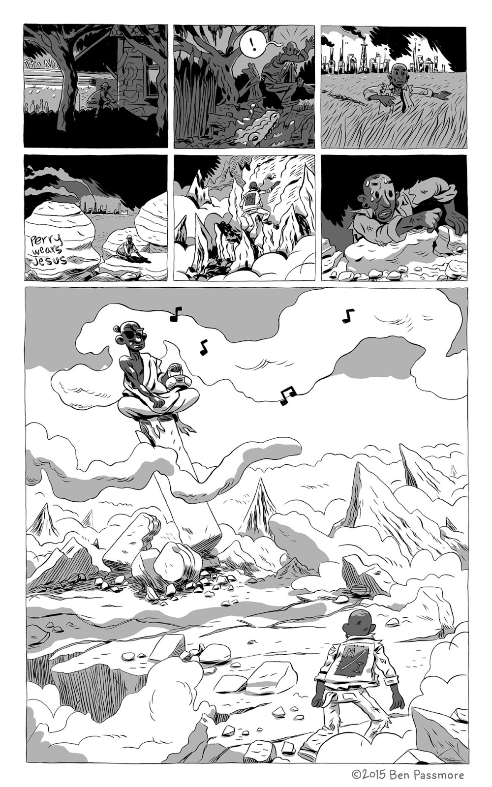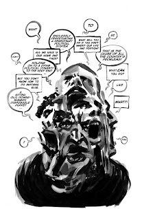 Following that bit of naturalistically-drawn genre is a bit of mark-making lunacy with DW and Mark Connery. Luke Healy's "Mountain Take Me" is another cornerstone of this issue, one that I've covered elsewhere. After a bit of comedic weirdness from James Stanton and Bailey Sharp (the former in the tradition of underground artists, the latter more like Anders Nilsen), Pat Barrett's "You Are We" is a tremendous bit of sci-fi combined with the possibilities and difficulties surrounding identity. Jon Chad's "Compleet Pwner" is a hilarious, nasty and deliciously drawn fine-line extravaganza featuring monsters, spaceships and the moon. In other words, all the things he does well. DW follows these two genre stories with something that's purely him: mark-making and pattern-creation in the service of exploring consciousness through the use of repurposed text.