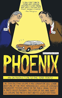 Adam Whittier's Phoenix: The Ford Pinto Story, is a tirelessly researched history of the Ford Motor Company's disastrous and dangerous Pinto model that was responsible for several deaths due to the way its rare gas tank leaked and exploded, even at slow speeds. Whittier documents the culture of auto makers at the time, which was that "safety doesn't sell", which led to the Pinto being rushed into production to compete with foreign competitors. The comic directly quotes the many outrageous things said and done by Ford executives, led by Lee Iacocca. Whittier makes some interesting story choices by going with a bright, whimsical drawing style as well as the decision to make "Phoenix", the Pinto prototype, have anthropomorphic qualities. In the context of the story and Whittier's rendering choices and (especially) color choices, having Phoenix talk made sense. In a story with events that were hard to believe (balancing profit over human lives), the fantasy element of Phoenix (as well as the prototype Edsel that came around telling Phoenix the real story) fit right in with larger-than-life characters like Ford and Iacocca. Balancing that fancy with direct quotes and stringently-researched hard numbers gives Phoenix the unusual distinction of being a critical documentation of corporate culture that's also entertaining. Whittier also touches on the idea that trying to recreate historical scenes always adds a fictive, narrative element; putting a talking car in there simply heightens that for the reader and allows Whittier to create a sort of Candide-like character whose fate is controlled by others.