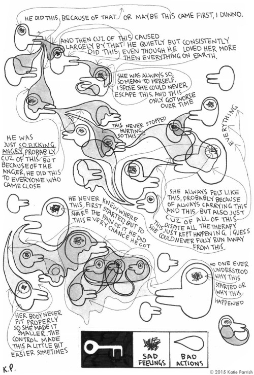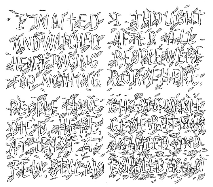 For example, editor Chuck Forsman didn't even contribute a comic--just a two page illustration. Max de Radigues seemed to have contributed a few pages from his Moose comic. The first four pieces in the book took up a lot of room but looked ill-suited for a black & white anthology. The lack of a clear link or theme also made these stories a slog; I eventually gathered that a loose theme may have been "life and death" or more specifically the line between the two. Damien Jay's "leaf writing" comic was fascinating as an experiment in immersive comics making, but once again it seemed to cry out for color to add greater clarity. Some of its pages were very difficult to read.