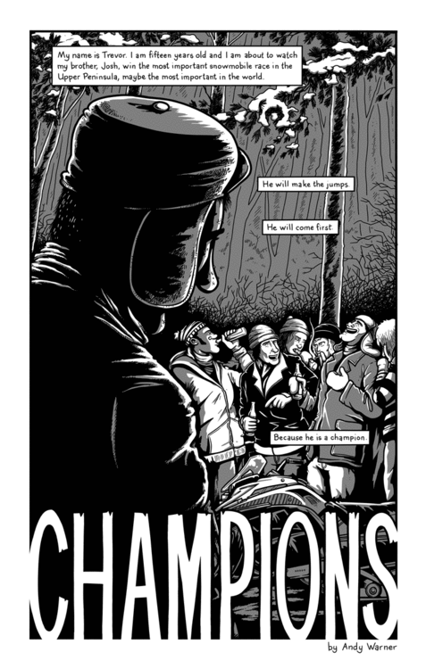 The same goes for "Champions", about a young boy's adoration of his live-wire older brother. Living in a house with an abusive stepfather, he sees in his older brother's reckless disregard for any kind of authority or sense a sort of heroic virtue. As his drunk brother prepares to go on a snowmobile race, Warner doesn't have to tell the reader the outcome of the race for the message to be clear: this is a doomed situation. Finally, "Boat Life" is the gentlest of the three stories. It's about a pair of friends in a classic Enid/Becky (from Ghost World) situation: one of them is going off the college and the other is staying home. How they carefully negotiate their future (through the language of put-downs and trash talking) is grafted to the graveyard setting, where the duo is getting high and dodging the creepy caretaker. While still firmly ensconced in their old paradigm of friendship, they take small, tentative steps to create a new one. Every one of these stories is about finding one's role, all of them to varying degrees of success. Warner's stories are polished without being overly slick and always try to get at the essential humanity behind every character.