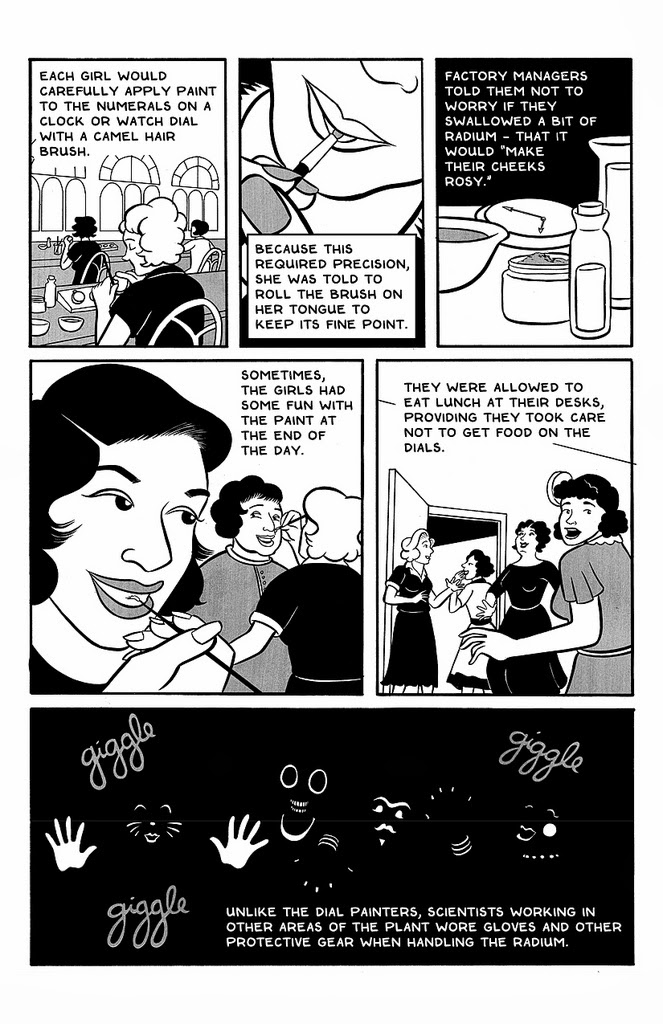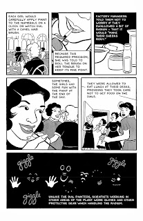 The other major story in this issue, Emi Gennis' "The Radium Girls", fits into her interests by being about unfortunate and unusual deaths but also snugly fits into this issue by unearthing the facts regarding the radium poisoning of female factory workers and the astounding callousness with which the Radium Dial Company treated these young women. Radium poisoning, which was in fact encouraged by the factory owners when they told the workers to swirl the radium-laced paintbushes in their mouths, is an especially painful way to die, but the company sandbagged and died until the end. Gennis' elegant, clear and decorative style frequently used an open layout and distinctive lettering, making it an appropriate pairing with Warner's piece. Kramer's own "Feeding the Meter" is much sketchier and lighter by contrast, which makes sense for this short story about a food truck owner's struggle to stay solvent in the face of onerous new laws. Erik Thurman's "Seoul Grind" is about the explosive coffee shop market in South Korea, how shops struggled to find out the best ways to make coffee and how shops manage to survive in the face of stiff competition. It's less a story than an interesting anecdote, one suited for just a couple of pages. This issue really seems to get it just right, mixing past and present while juxtaposing certain commonalities between both while getting at issues with some resonance.