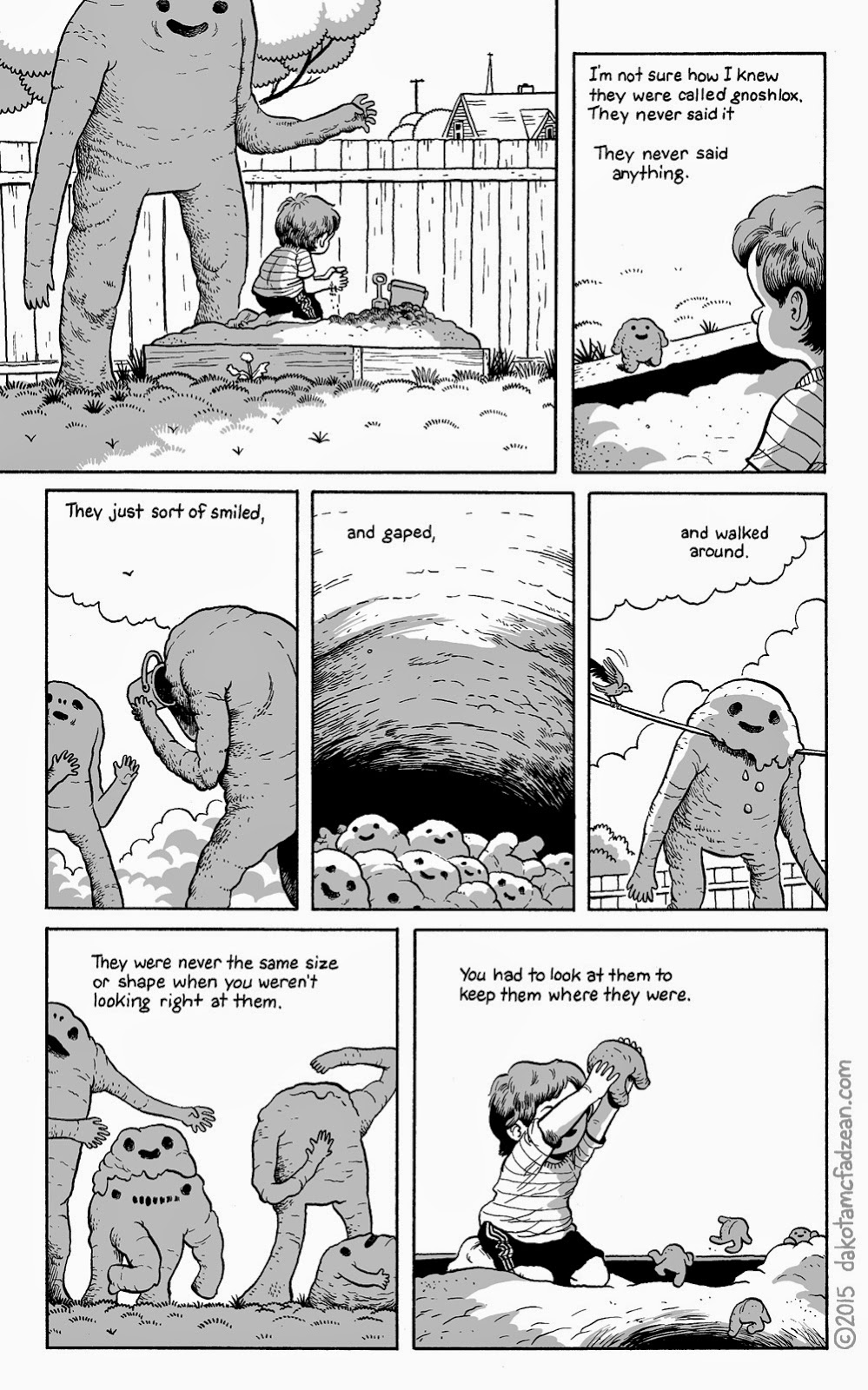 Finally, Dan Rinylo and McFadzean contribute two stories that dwell on ontological concerns. For Rinylo, it's being given an absurd and meaningless tour of the world by a higher being, who shows him his total insignificance in the face of things when he complains about the stupid stuff he's being show. For McFadzean, it's a memory of using clay to create creatures called Gnoshlox; it's a child's magical realist memory that supersedes anything that came earlier. In both cases, pondering meaning is fruitless, even though it's something we either can't resist trying or can't stop from entering our minds. McFadzean's stories always linger in one's mind when he talks about the lives of children, not unlike an Eleanor Davis. That's why it's so exciting to see him collaborate with like minds as well as creators he respects who work in an entirely different style; it's clear that editing Irene has stretched all three of the editors.