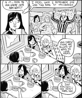 McFadzean's closest aesthetic compatriot in this comic is Sophie Goldstein, whose "Edna II" I reviewed here. Like McFadzean, Goldstein's storytelling is crisp, clean and assured, which allows her to go off on flights of fancy or use cartoony figures in a story that is otherwise naturalistically told. McFadzean drew DW's story "Ten Minutes' Break", a fascinating and funny workplace strip about three creatures essentially dealing with creation myths and alien civilizations. However, it's entirely from the point of view of working stiffs taking a break from their otherwise endless labors. McFadzean's every bit as good drawing fantastic characters and weird scenery as he is drawing average people and the plains of Saskatchewan.