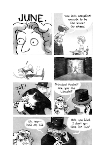 Warner's interest in reportage drew in a couple of entries. Emi Gennis is well-known for her interest in unusual deaths, and in "Nyos" she reports, in her typical naturalistic style, of how an eruption of carbon dioxide from a nearby lake killed nearly everyone in an African village. The point she hits on that's interesting is that the mysteriousness of the event made the very few survivors think that the world had ended, and wondered when they left if anyone would be there to see them. Jackie Roche's "Black Boots" takes a micro view of a big event: the assassination of Abraham Lincoln. You might know that he was taken to a room across the street; what you might not know is that the room was a boarding room rented to a soldier named William T. Clarke, who later charged admission to his room for morbidly curious onlookers. "A Dream", by Warner & McFadzean, has the feel of reportage, as it's about a woman recalling a dream she had about imprisoning her brother, only to have her situation reversed. It's very much a "tell not show" story, as the artists are more interested in evoking the sense of a story being told then telling that specific story.