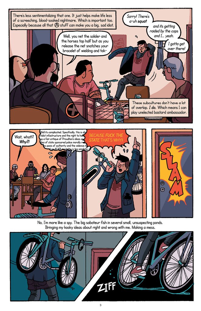 No Gods, No Dungeon Masters, by Io, Rachel Dukes, Andy Warner & Hannah Fisher. Published by Avi Ehrlich, Silver Sprocket has become a publisher at the intersection of punk culture and geek culture. After years of releasing punk records, Ehrlich slowly made the transition to comics, and their most recent line of comics has cemented this. This mini was reprinted from the Subcultures anthology published a couple of years back, polished up a bit and recolored. The story is very much about a genderqueer person deeply steeped in RPG and geek culture who also identifies as an anarchist and part of punk culture. The story involves them going from a D&D session to helping thwart a police crackdown on a squat ("he just started screaming 'cast magic missile' and throwing bottles"), wondering why this cultural intersection didn't seem as natural to others as it did to them. Dukes was a perfect artist to portray this, as a queer person also deeply rooted in geek culture and punk politics. As such, there's a cheery, bright quality to this comic that carries over into the more political aspects of the story, since they are folded into the main character's fantasy life anywya