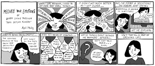 In many respects, the thesis year is an opportunity for students to not only demonstrate what they've learned, but to also reveal how far they have to go. It's a dry run for the process of becoming a professional cartoonist, or at least one who makes comics one of the top priorities in their lives. This is the chance for a young artist to figure out what they're trying to do as a creator. Roy said "I want to make work for anyone who wants to read it, and I try to consider the clarity, accessibility, and audience at all times. To think of my reader, but not for my reader." It's a chance for a young cartoonist to see their work through the eyes of a professional. However, as Stout warns, "Your advisor is not meant to be an all-knowing vending machine of comics wisdom. They are meant to be a professional contact. Build a relationship with them. They want to help, so make it easy: learn their strengths, ask questions directed to those strengths, and be ready for feedback."