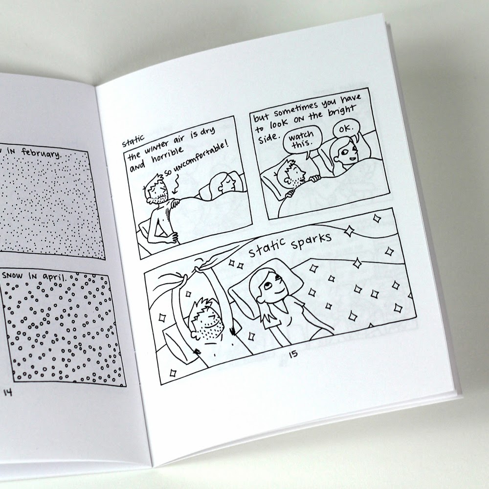 Irene #2, edited by Andy Warner, dw and Dakota McFadzean. This is another strong entry from this mostly-group of grads from the Center for Cartoon Studies. I like the push-and-pull in its sensibilities with Warner (a naturalistic storyteller), McFadzean (an artist with a delicate but cartoony line) and dw (who specializes in abstractions, patterns and text appropriations), leading to a book that has a bleakly humorous streak. Take McFadzean's "Standing Water", for example. This one features a young boy making his way around his neighborhood wearing a mask, only the entire area is under water. Friends, family and pets float limply in the water, and his attempts at interacting with the world reveal a hidden well of meanings that have lost all their significance in the wake of what is essentially the end of the world. What seem to be acts of revenge or cruelty lose their meaning, leading him to a sense of sad resignation in a totally absurd situation.