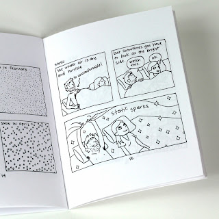 For example, editor Chuck Forsman didn't even contribute a comic--just a two page illustration. Max de Radigues seemed to have contributed a few pages from his Moose comic. The first four pieces in the book took up a lot of room but looked ill-suited for a black & white anthology. The lack of a clear link or theme also made these stories a slog; I eventually gathered that a loose theme may have been "life and death" or more specifically the line between the two. Damien Jay's "leaf writing" comic was fascinating as an experiment in immersive comics making, but once again it seemed to cry out for color to add greater clarity. Some of its pages were very difficult to read.