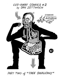 Cut-Away Comics #1 and #2, by Dan Zettwoch. Zettwoch is a great example of a well-established cartoonist who was curious to take advantage of the Oily format for a short series. It's also fitting for Zettwoch, given his long history of self-publishing and a DIY point of view. A student of history and 19th century American history in particular, this comic follows a particular episode in the life of (as Zettwoch describes him) "woodsman/dandy/ornithologist" John James Audubon. He was fascinated in particular by a bird called the Chimney Swallow, and he discovered a huge, dead tree that served as the nest for hundreds of the birds. As always, Zettwoch is drawn to peculiar details of eccentric and inventive personalities, and Audubon certainly fit that bill on both counts. Zettwoch mixes his cartoony and exaggerated character design with his wonderfully precise cut-away diagrams of trees, the digestive system of swallows and lots of other information. It's a delightful examination of both a legendary figure in the field of ornithology as well as a clever series of solutions to finding out just how swallows lived in that tree.
