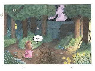 Let's start with Hayes. His latest Benny & Penny book is called Lights Out!, and it's once again an evocatively drawn story about two siblings at bedtime.Hayes has an incredible knack for portraying their relationship with great affection yet still understanding the ways in which children squabble and generally enjoy making each other miserable at times. Here, the mischievous Benny can't settle down at bedtime, annoying his sister in every way imaginable, until he has to go get his all-important pirate hat from the playhouse outside. Throughout the series, Hayes has loved folding back a story's conflict onto the aggressor (usually Benny), putting them in the sort of situation that they taunted the other about. Once again, Hayes masterfully balances his background as a traditional illustrator of children's books with making this work as a comic, including finding ways to lead the reader's eyes across the page as simply as possible. At the same time, he provides a wave of eye pops, as characters bleed off-panel or tiny bugs pop up in the same place. For the youngest of readers, these are perfect story and art objects.