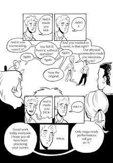 Jarad Greene will graduate CCS in 2017, and his path has been an interesting one. He started off studying criminology & criminal justice, added theater studies and is now getting his MFA in cartooning. His comics employ a smooth, pleasant line deployed for a number of different storytelling and genre choices. Scene & Heard is an autobio comic about that very transition from his pre-law studies to embracing the arts. It studies the progression of choosing acting over speech as something that could help his future law career, precisely because it seemed more intimidating but also more potentially rewarding. The drama classes he took were grueling because it demanded a level of emotional presentness in the moment that is difficult to achieve, but once he did, it unlocked a new level of confidence in him as a person. What I like about this comic is that while there are psychological and emotional components in becoming an actor, Greene reveals that it's mostly a lot of practice, work and repetition--pretty much like any art or skilled activity. This comic is also all about understanding one's skill level when contemplating what to do next. Success for Greene meant conquering his first scene, building on everything he had learned up to that point. Unspoken in all of this is how this process obviously repeated itself in making this comic. Greene keeps things simple, staying within his wheelhouse as a draftsman but aggressively using unusual page designs to break up his story, varying panel size and layout as a way of modulating emotion and action. It's a very "talky" comic, but Greene also knew when to shut up and let the images take over the storytelling, like in one sequence where we see him really start to fall in love with acting.