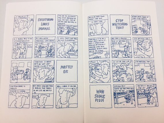 There's a sweetness to these strips as Bravo writes about daily life with his son Ollie and his wife Penny. The strips with his toddler son are excellent, as Bravo's joining a growing number of cartoonists who express the day-to-day joys and frustrations of raising a child in a realistic way. The extreme mood swings of children as they are developing can be frustrating, but Bravo keeps it in perspective as he documents it. Bravo also documents the new pregnancy of his wife in a poignant manner, acknowledging the fear that can be a part of early pregnancy when miscarriage can occur. One thing I liked about this comic is that Bravo treats it as a sort of document regarding his self-improvement as a person and artist. He struggles with how to address the subject of his parents, with whom he had some unresolved issues. He takes a writing class to improve in that area. He's constantly working and puttering to improve his New Orleans home. He goes to therapy and tries to process the trauma of hurricanes.