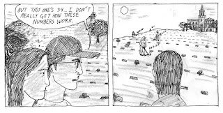 The second story, "From Eden Hill", is about a young woman (possibly the artist herself?) who has a ghostly encounter when she believes a woman named Aidy Leem tapped her on the shoulder. When she looks her up on the internet, she learns that a woman of that name is dead and buried in the local cemetery. There are then several pages of what seem to be anticlimactic dead ends as they track down her grave. Then the protagonist realizes that her room is the only one visible from the gravesite, which leads to some mind games later on when it appears that a shadow in her room has an unnatural quality to it. Like the first story, the tone is consistently low-key and emphasizes small talk and character interaction, which makes the story's reveal all the more surprising. Pallmall's figurework is her biggest weakness at the moment, as her figures lack fluidity. Her naturalistic approach sometimes falls short as a result, with some panels looking overworked and others underdrawn (usually the figures). Still, her ability to create mood and depict malaise with an undercurrent of far more serious emotional concerns makes these stories unusual.