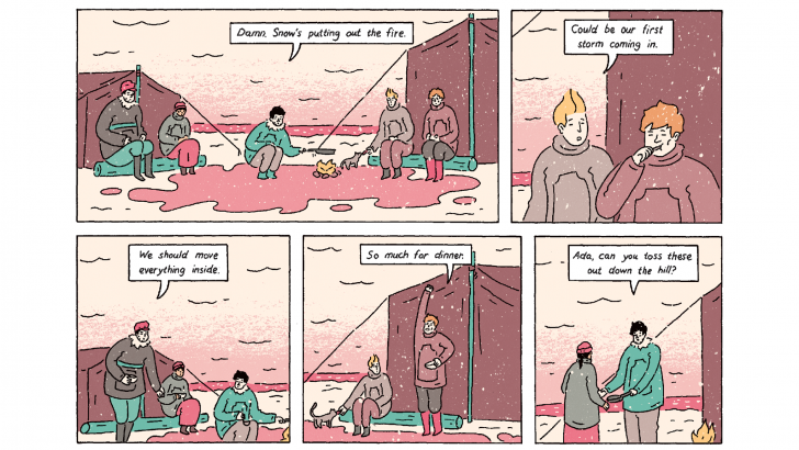 The first narrative in the book concerns the ill-fated 1913 Arctic expedition commissioned by Vilhjalmur Stefansson and captained by Robert Bartlett, the second narrative is about ill-fated 1921 Arctic expedition that included Inuit seamstress Ada Blackjack, and the fictional narrative follows a modern-day professor forced into a sabbatical who researches the two expeditions. The common themes include a shocking and selfish disregard for others in pursuit of one's passions, tremendous resilience and courage in the face of impossible odds, Healy smartly gives the reader a taste of each of the storylines at the beginning of the book, all of them in media res, in part to deliver dramatic moments and pique the reader's interest as to how those moments were arrived at. A running theme in Healy's comics finds glib, silver-tongued characters pressuring generous-hearted characters into doing things against their better judgment.