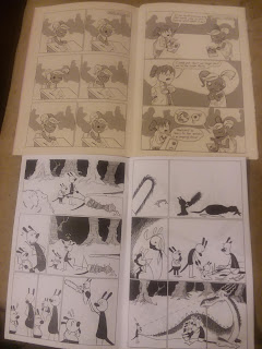 Margo #1 and Collage, by Pat Leonhardt. I had the pleasure of sitting next to Leonhardt watching him work on Margo #1. He's chosen one of the tougher cartoonist career paths as a humorist. Like his nearest CCS predecessors Garry-Paul Bonesteel and Ben Horak, Leonhardt is mining horror in particular for comedy. What makes it work is his fantastic attention to detail, especially in the color portions of his work. Margo is the middle-school protagonist of this story, and as it begins, she's just another weird girl going to school--except she happens to be a zombie of some kind. A zombie wearing a dress with unicorns and pizza on it (a level of detail that made me laugh out loud), but a zombie nonetheless. Margo can only communicate in the form of picture-rebus puzzles that her best friend can translate, but she has to navigate the usual school problems. For example, there's the mean girl clique, the "Beckies" (one of them appears to be an alien, but she wears a cute hair bow, so apparently this is fine). When Margo gets mad, she bites--and this is what sets the plot into motion, even if almost all of it takes place in the background of the story.